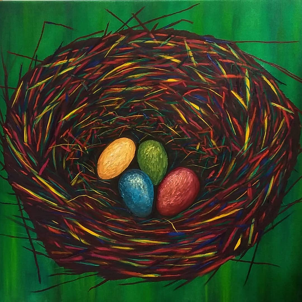 This was one of my first large oil paintings I created after a long break from making art. It was made in my first apartment after returning from the Peace Corps, and the apartment was an absolute nest of a place. I started this before the pandemic and finished it when I was told to nest up at home indefinitely.
